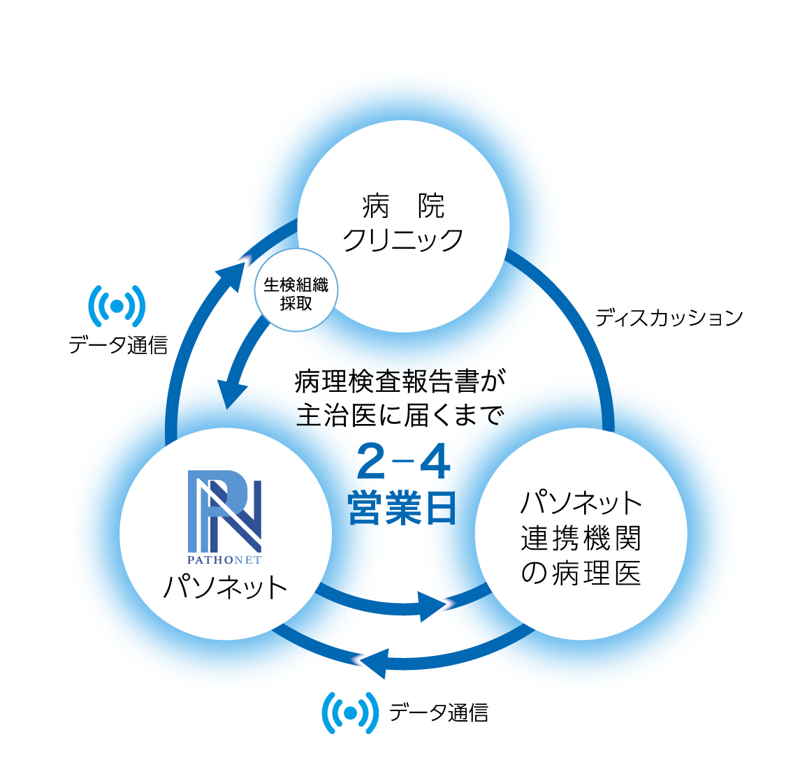 病理検査ネットワーク Tweet お預かりした病理組織標本は、高解像度画像としてデジタルデータ化され、これを病理専門医が専用回線で受け取り、その画像とガラススライドをもとに速やかに検査報告書を作成。データ通信の利用により、検査報告書が届くまで、わずか2~4営業日と圧倒的な早さを実現。VPNの利用でセキュリティも万全。